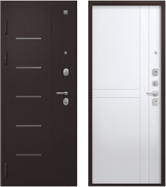Три контура уплотнения защищают квартиру от постороннего шума и сквозняков. Сталь толщиной 1,4 мм обеспечивает достаточную прочность при умеренной массе готового изделия. Для обеспечения дополнительной жесткости конструкции используется технологический вертикальный гиб(штамп) с внешней стороны полотна. Наполнитель двери – пенополистирол, двойной слой которого обеспечивает тепло и шумоизоляцию двери.